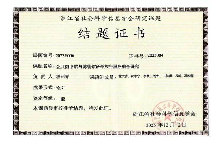 近日,浙江省社会科学信息学会公布2023年度课题研究结项名单。截至2025年10月15日,学会收到6份课题结题验收材料,经专家评审、公示等严格流程,《清代藏书家甘福、甘熙父子生平考述》(课题编号2023Y001)等6项课题顺利通过验收,准予结题。