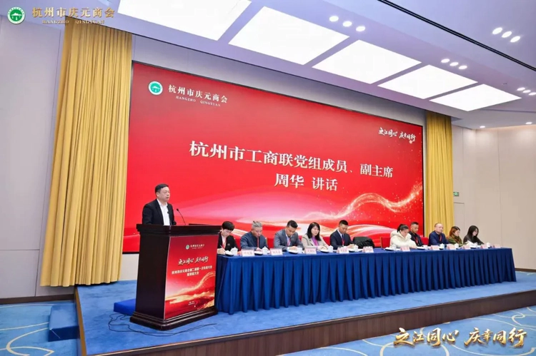 杭州市工商联党组成员、副主席周华出席大会并发表讲话。他首先祝贺杭州市庆元商会换届成功,希望商会进一步坚持党建引领,听党话、跟党走,确保商会的发展健康,行稳致远;要坚持服务立会,夯实发展根基,牢牢把握服务会员这一根本宗旨,聚焦企业在融资、用工、转型、出海等多方面的需求,整合资源,搭建平台,提供专业化、精细化服务;鼓励商会带领广大会员企业,以“”创新、诚信、社会责任和国际视野”的新时代企业家精神,主动融入“296X”的产业发展体系中。