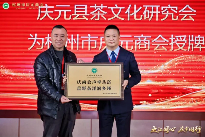庆元县茶文化研究会常务副会长吴旺进、秘书长叶大华出席了本次大会,并代表庆元县茶文化研究会为杭州市庆元商会授牌,上书“庆商会声牵共富,荒野茶泽润乡邦”,以褒扬商会在荒野茶宣传方面作出的贡献。