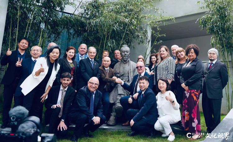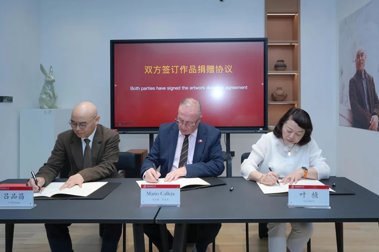 在现场嘉宾的共同见证下,马里奥·卡莱亚市长、吕品昌教授和上海远东环球实业集团文化科技有限公司董事长叶桢女士三方共同签署了雕塑捐赠协议,并为作品揭幕。与会嘉宾在雕塑前合影留念,定格下中马文化交流的重要瞬间。